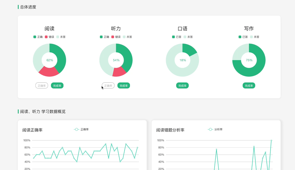 在Dashboard,你可以随时监控自己的做题数据,不仅有完成情况、正确率,还有对学习效果的关键性指标:每题时间控制、每道错题的分析等等。