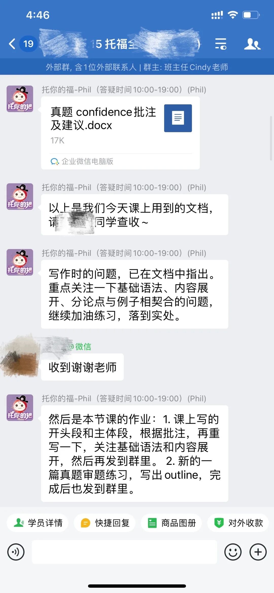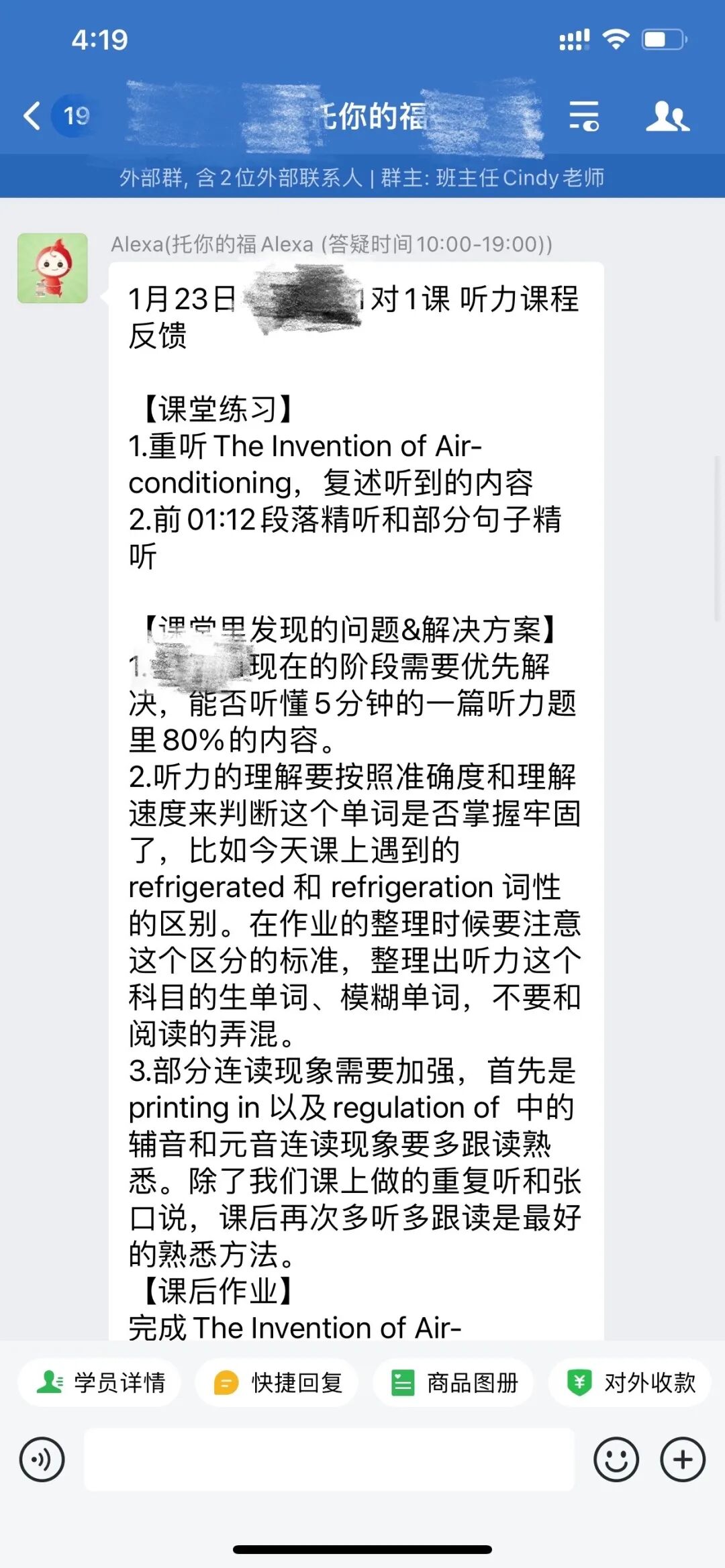 课程结束后,老师在学生的专属个人学习群内,反馈本节课的课程内容、课堂里发现的问题和如何解决、课后作业。