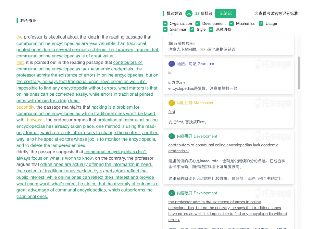 对于口语写作来说,就更珍贵了。你需要能判断自己的每篇作业分数是多少,问题在哪里,每个问题如何改正能拿到多少分。