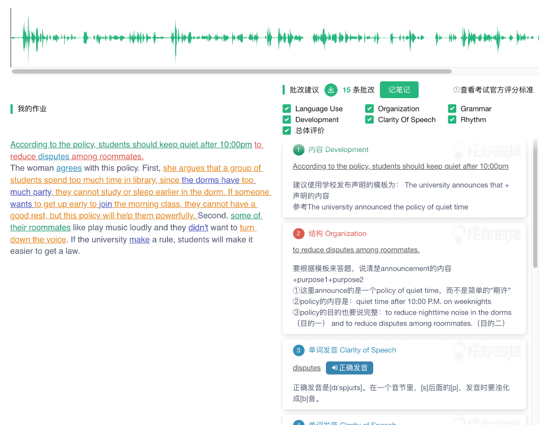 口语写作作业均由任课老师亲自批改,并由精批系统展示为可分类、可互动的批改结果,再也不用看word批改啦!