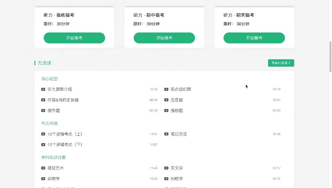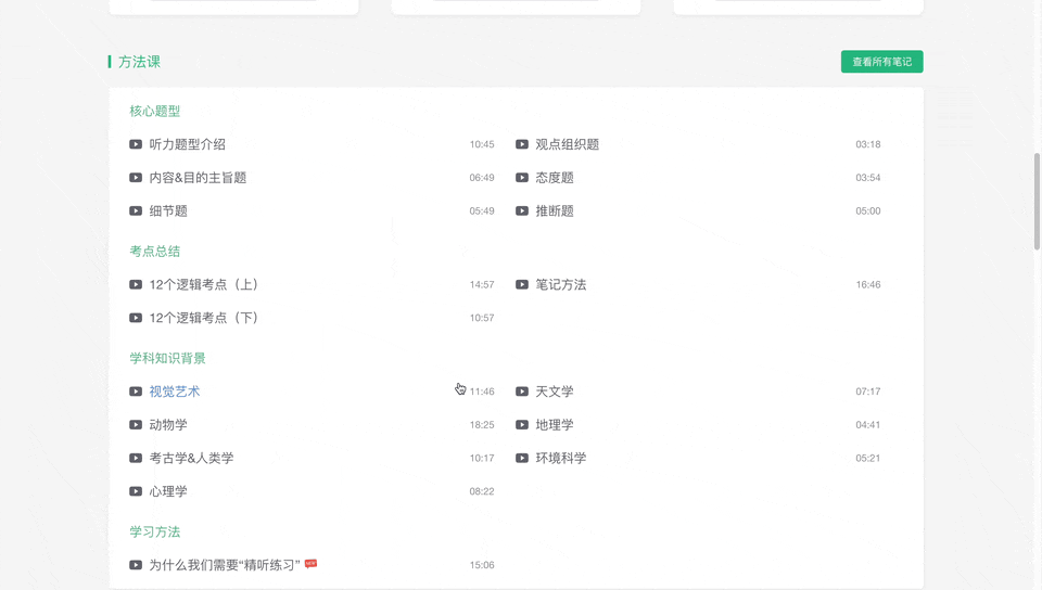 点击听力的“开始学习”,你会首先看到一个简单的学习指南,和听力科目的第一个先导视频。这个视频是免费开放的,没有报名的同学也能看,讲解了托福听力考察的核心能力,以及备考的关键方法: