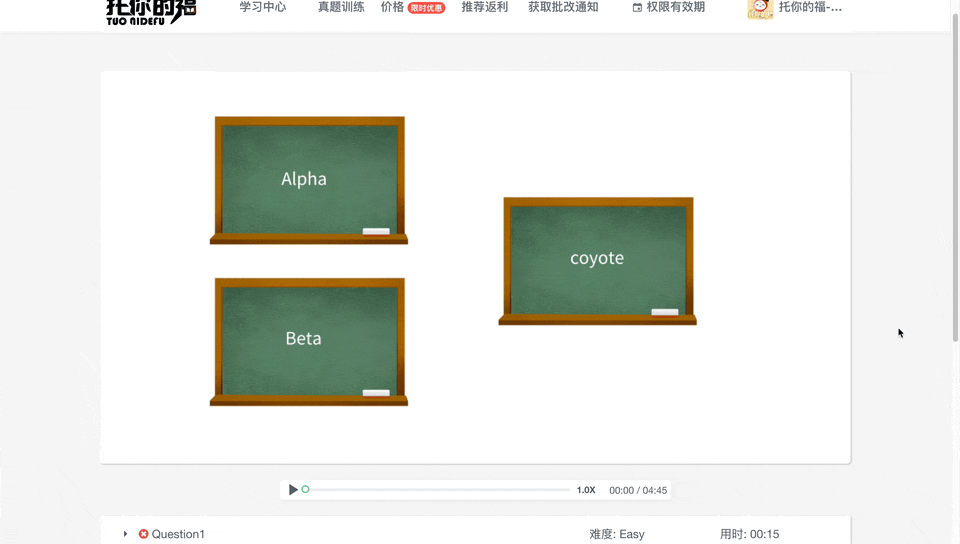 托福的考场真题库非常庞大,普通考生不可能全部刷完。托你的福会参与每一场托福考试,筛选出近期考试概率更大的几十套四科真题,加入进满分计划系统中,模拟真实考试练习和逐题学习。
