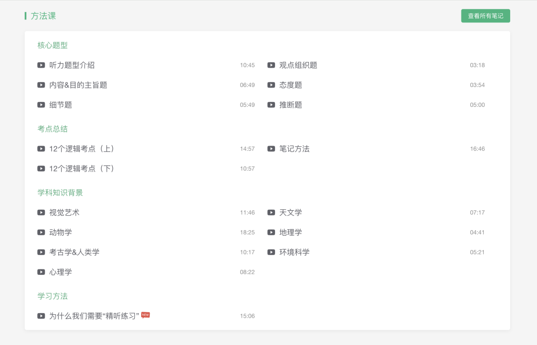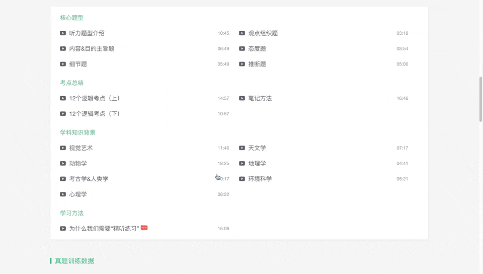 满分计划方法课就是将托福直播课里所有会讲的内容重新编排,形成一个个简短但具体的视频课程:第一部分,就是托福听力的核心题型。这在培训机构会耗费你上万元学习的内容,我们只需要6个视频就讲的明明白白:第二部分,是逻辑考点总结和关键的笔记方法。由于托福听力在播放音频时不展示题目,抓信息点和考点,并以极快且易理解的方式记录下来,就奠定了听力分数的基础:第三部分,是学科背景知识。托福听力讲座类似大学里的专业课堂,上至天文地理,下至考古人类,需要提前储备一定的知识和词汇(如apply在对话里的意思一般是“报名”,但在讲座艺术史的意思是“上色”),才能正常听懂:托福考试在进化,我们的教学方法也会不断迭代,这里的题型解析和答题技巧也在一直更新(至今已是第7代)。以精听为例。培训机构会教你听写或听抄,但你会发现花费了数十小时听写,下次遇到这篇听力,居然还是听不懂。我们在教学中发现,听写根本无法提高学生的听力理解能力。所以,我们改进了精听法,并在这一环节向你介绍新的精听方法:学完以上,恭喜你完成了第一轮托福听力课的学习。接下来就要进行更加针对性的真题练习&学习了。托福听力的真题是我们从考场上直接取得的题目,不是TPO(官方练习题)也不是网上流传的所谓真题。我们的真题是现在仍在托福考试题库中的题,题库数量也是非常大的,常常会考到原题: