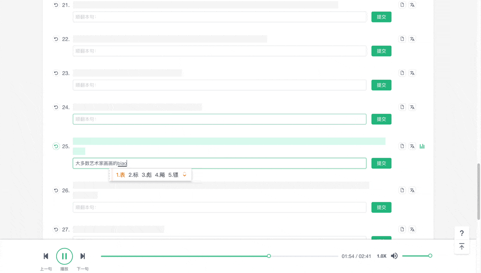听力笔记视频是托你的福的特色,也是帮助很多托福考生突破自我极限的一个环节。完成一整篇真题的练习和学习后,在复习界面可以看到全部题目的完成情况,也可以重新学习课程:但,这对于这篇听力的学习,才只进行了一半。接下来是提高听力实力的关键步骤:正确的精听法。我们将每句话制作成“洗脑循环”,让你在反复听句子是过程中,用中文打出这句话的含义。提交你的句子含义后,AI会对归纳准确度进行评分。你可以在句子评分后点开翻译自查理解有误的地方:这句话听懂了百分之多少?没听懂的部分是因为单词发音不熟悉?还是连读没听出来?或是语法结构没听懂?刚开始精听觉得太难?那么你可以先把倍速调整成0.85或0.75倍。想要挑战满分?把倍速调整成1.25或1.5倍试试!听力提高没有捷径,精听是关键方法。在这一步做对了,你会猛地发现,突然有一天全都听得懂了。