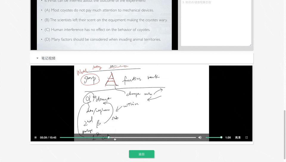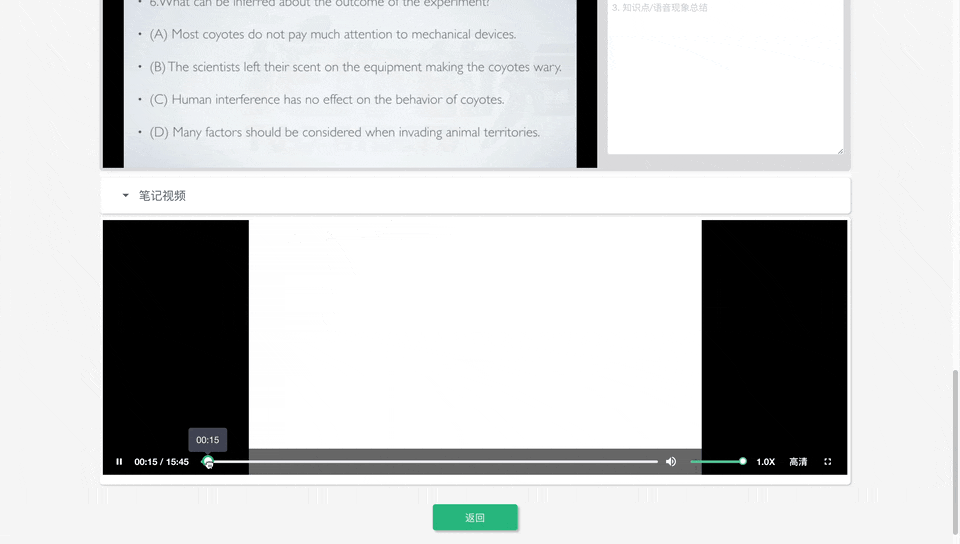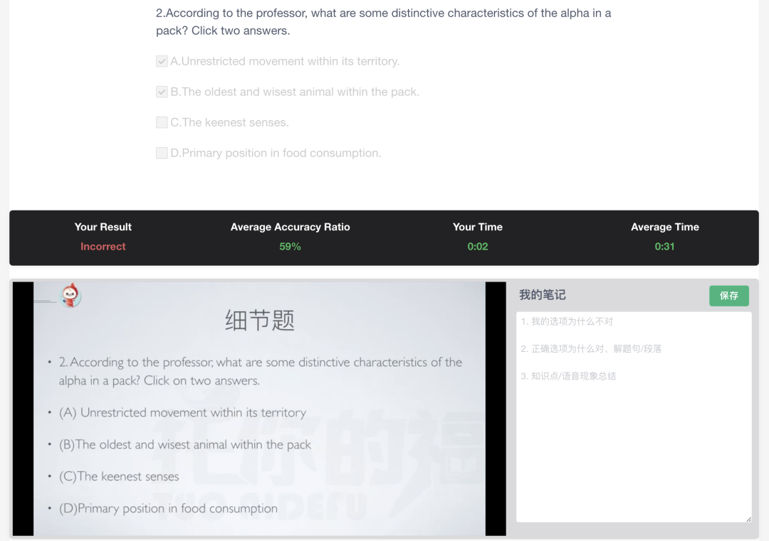 由于听力的连续性,当你每完成一整篇听力,会获得每道题正确与否的反馈、本题平均正确率、你的用时、平均用时等。并且每一道题都会展示Ivy老师录制的视频课程,每一道题都有这样一个视频,梳理原文听力现象、总结信号词抓取方法、分析题干,讲解做题思路、正确和错误选项分析、同类题型考点、举一反三等内容。这样的课程内容,不是题目解析这么简单,只有在极其精细的托福班课中,或者一对一课里才会讲解到:你可能已经发现,即使做完题之后也只能看到自己做错了,看不到正确答案:我们用这样一个小小的阻碍性设计,解决一个致命但经常被忽略的问题:学生看了正确答案之后,仿佛好像就知道自己为什么错了,但是实际上根本就没有完全理解题目和选项,没有纠正错误思路,下一次遇到这个题还是会错。所以我们强迫你看完整个视频才能知道正确答案,利用你追求答案的欲望学完正确的解题思路。如果你看完视频仍有困惑没有解答,也可提交你的错题答疑给老师,待老师针对你的独特问题进行回复:如何在5分钟的听力音频放完之后,还能记住整体的逻辑结构和全部的细节?关键点就在于在听的时候如何记笔记。记笔记不是把听到的单词都写下来,不然anthropologists和pyschological这种词汇刚写完,你会发现听力已经结束啦!其实在方法课中老师已经告诉了你如何记笔记,但只听理论没有用,你需要跟着老师一起记。