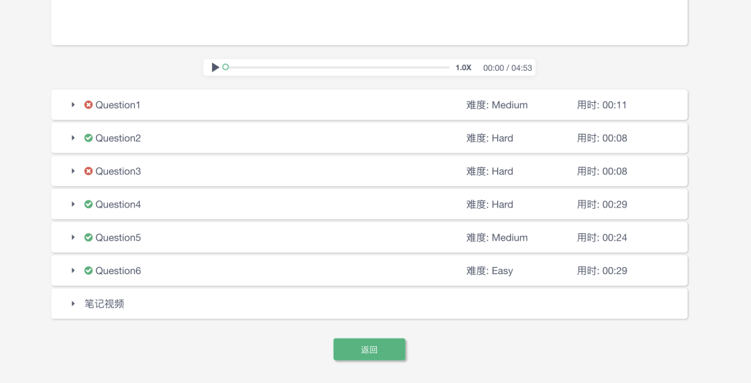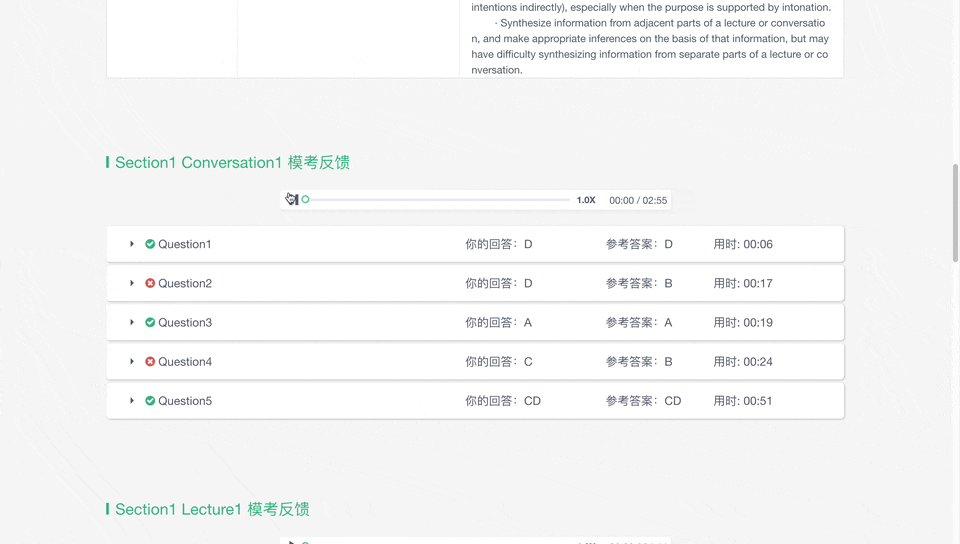 再往下就是具体的题目,每一道题的题型、你的答案、正确答案,和你的回答用时。点开就能看到原文音频和题目: