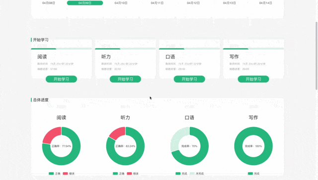 阅读和听力展示的是整体正确率,口语和写作展示的是题目完成比例: