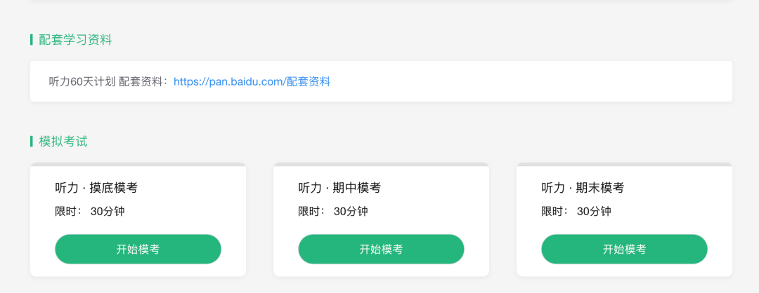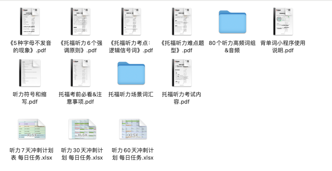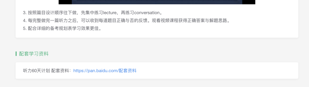 看完了这个先导视频,我们就可以正式开始托福听力的学习了。我们编写了一系列配套学习资料,和一个详细的每日计划表,可以在这个位置下载下来:计划表写好了每天的学习任务,你可以根据自己的实际时间进行调整:考试题目就是考场里直接拿下来的真题(不是TPO练习题),完全还原实考难度,界面、考试时间也和实考一致。最高档满分计划包含3次模考,可以用来摸底、期中和期末: