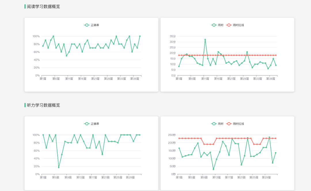 左边的图表展示了每一篇的正确率,能看到在你不断积累的过程中,正确率的变化。另一个图表是做题时间,这是考托福一个很关键但容易被忽略的指标,用时红线是考试规定的答题时间,绿色的就是我们做题时实际的答题时间: