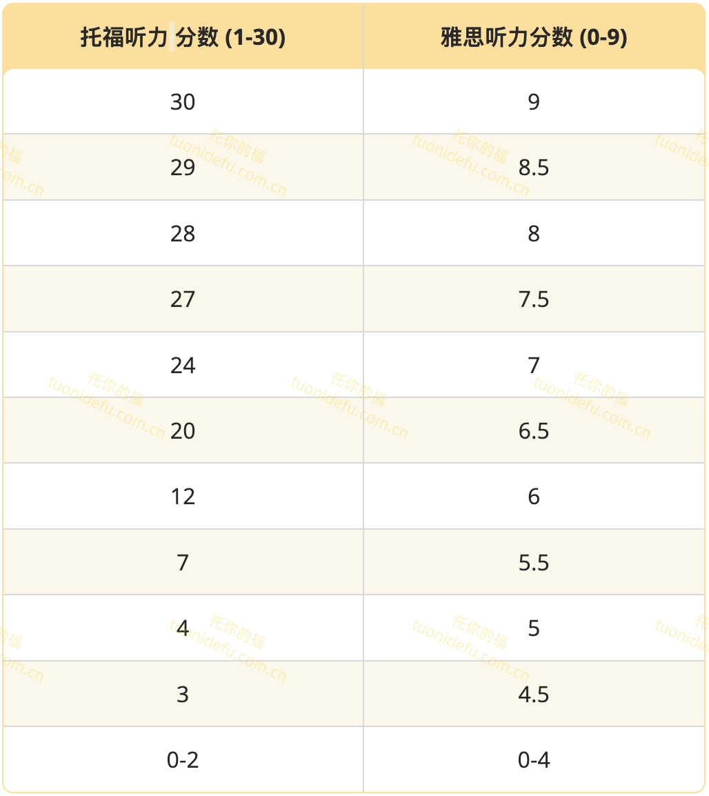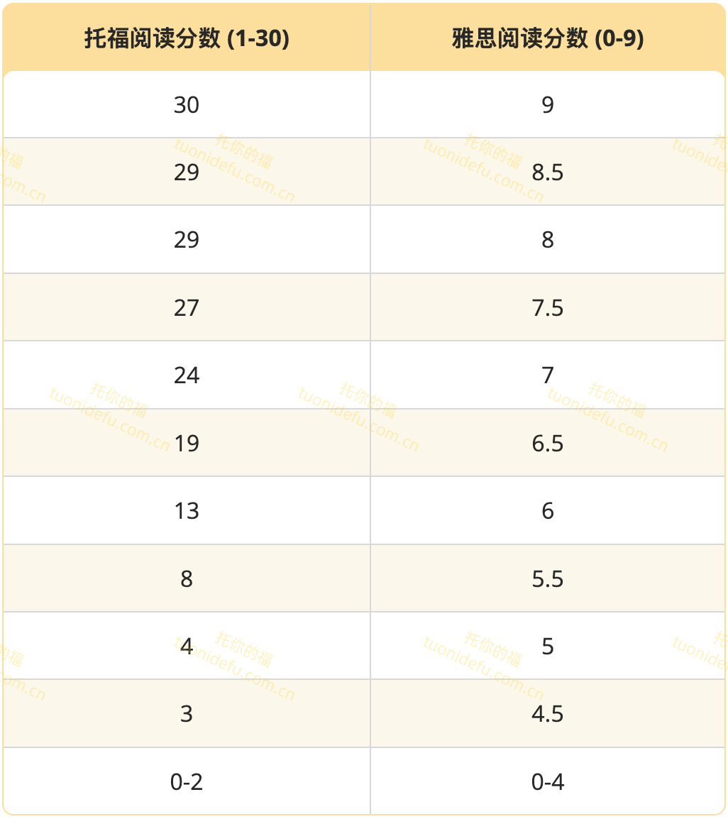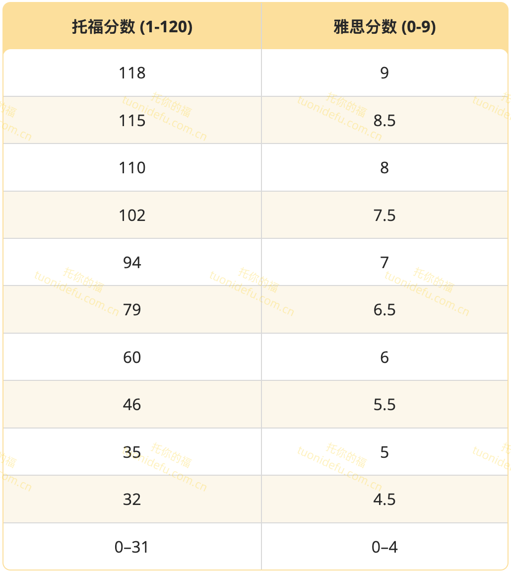 最常见的 TOEFL iBT 转换为 IELTS 的方法是使用大多数学校和机构认可的转换表。看看下表,了解 TOEFL iBT 总分与 IELTS Academic 总分的对比关系。