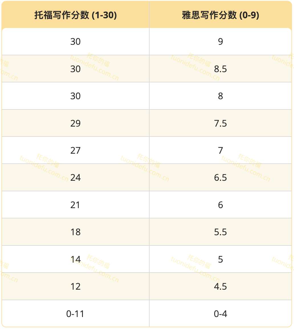在 TOEFL iBT 考试中,你会分别在阅读、听力、口语和写作四个科目上单独评分,每个科目的分数范围是0到30,分数增量为1。这些分数合起来就是你的总分,总分范围为0到120。