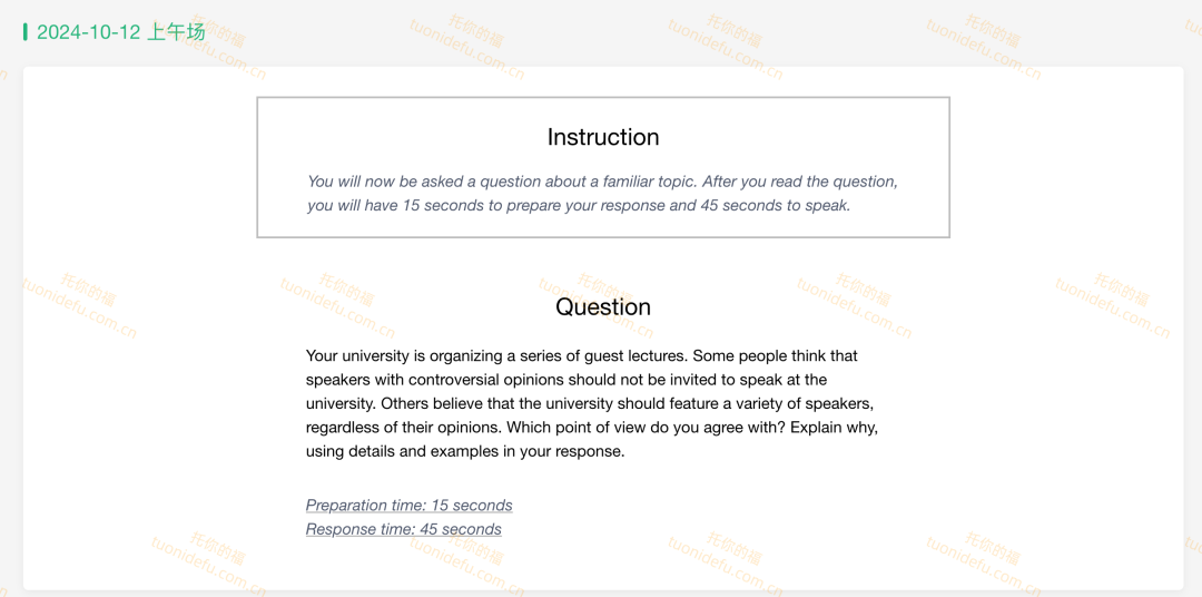这道题让我们讨论大学是否应该邀请具有争议观点的演讲者。题目中的难点词汇controversial opinions指有争议的意见。我们的口语预测中就有这道题,很难,因为controversial opinions这个概念对中国学生来说很陌生,难点就是中国教育不教controversy或差异化、多样性,导致考生没有相关的个人生活经历。